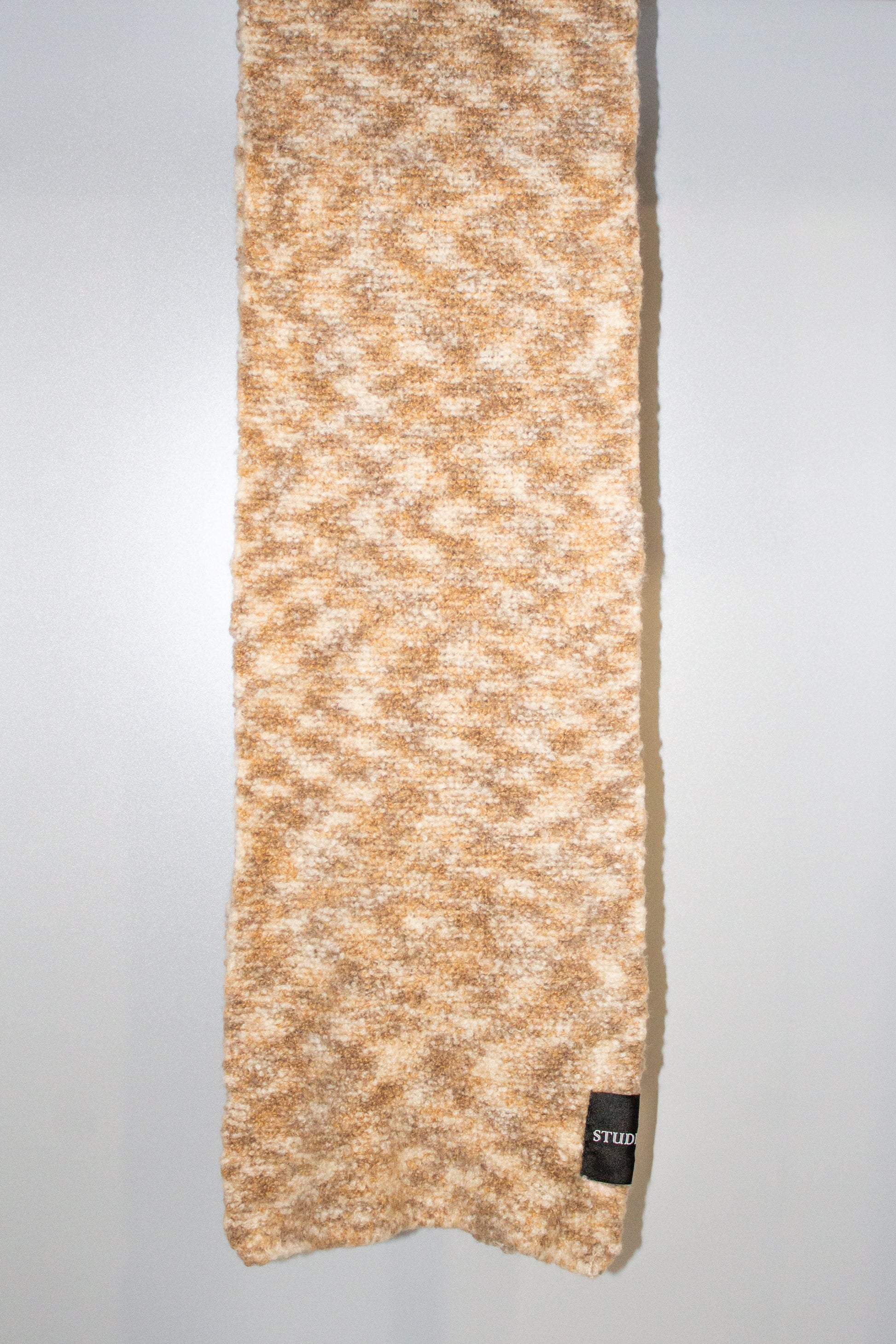 This scarf is knit from a refined blend of cashmere and silk, developed in a softly clouded mélange. Spun into delicate bouclé loops, the yarn is lightweight and breathable and  finisher with a silk binding that offers a smooth, gentle feel against the skin.