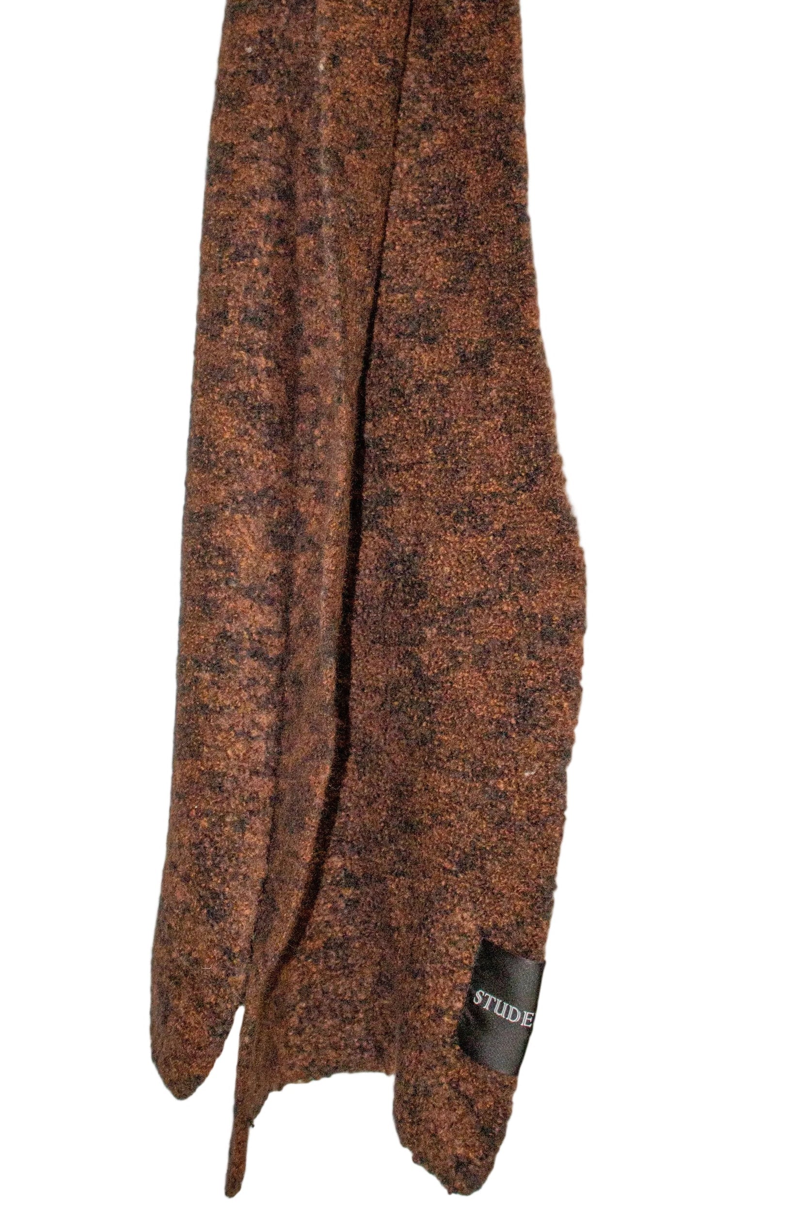 This scarf is knit from a refined blend of cashmere and silk, developed in a softly clouded mélange. Spun into delicate bouclé loops, the yarn is lightweight and breathable and  finisher with a silk binding that offers a smooth, gentle feel against the skin.